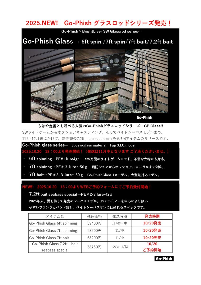 お待ちかねの皆様へご案内です。Go-Phish Glass4機種は本日(10/20)18:00より発売(7.2ftはご予約フォームにて受付開始)といたします。