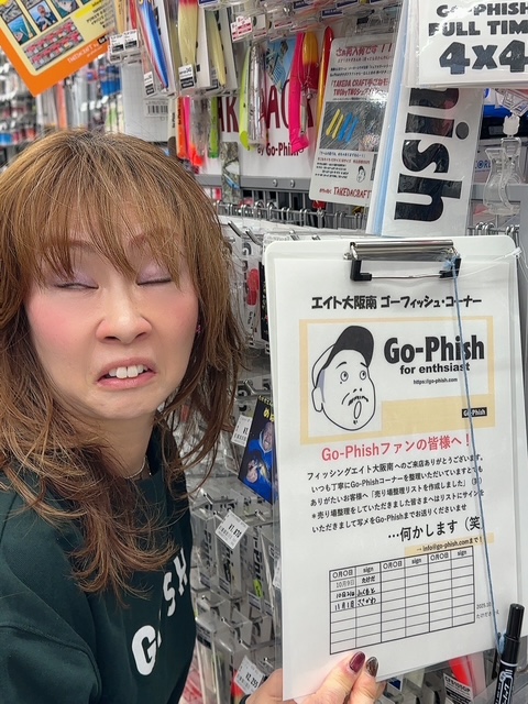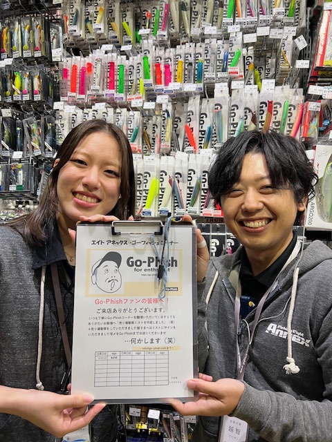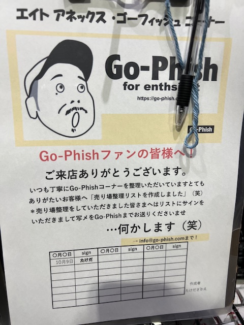 好評???フィッシングエイト本店さん、大阪南さん、に続きましてフィッシングエイトアネックスさんのGo-Phishコーナーにも設置させていただきました「売り場整理リスト!」。アネックスへお越しの皆様どうぞよろしくお願いいたします。Go-Phishカスタムルアー/タケダクラフトワーム/SHORES GP/Go-Phishロッドとアネックス様では売り場も分かれて設置いただいていますのでどうぞよろしくお願いいたします。…もし整理をいただけましたら必ず画像を送ってください…何かします!!(笑)