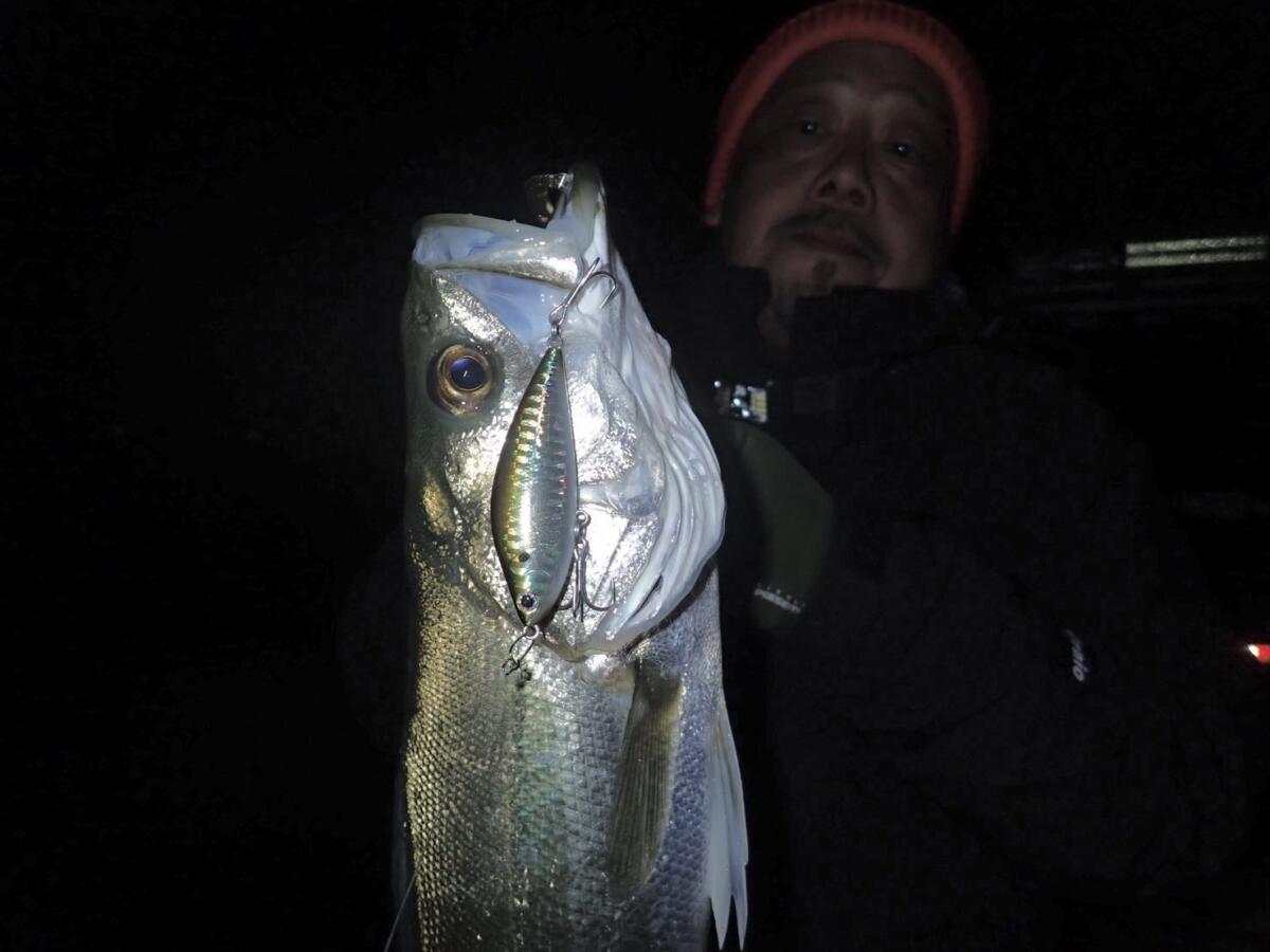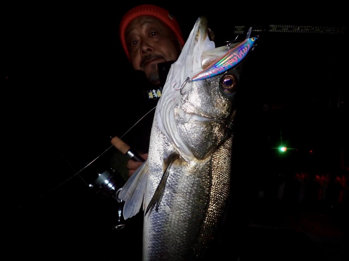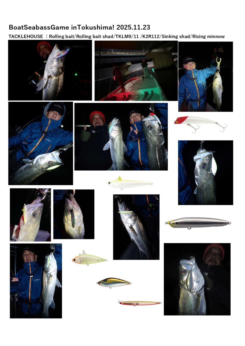 っとアットホームなイベントとは言え午後3時の終了時にはそれなりに疲れてはいましたが、片づけを終え、ボートキャプテン松下くん行きつけのガストでディナーをし、日没からは「徳島ボートシーバス」。現在の遊漁船グリッターのキャプテン松下くんは彼が高校生からの仲。(岡山から徳島の大学にきてもう5年とか?)すっかり釣りざんまいの毎日の様でしてこの日も「行きましょうタケダさん!」っと誘ってくれました。無風&微風のこの日の吉野川河口域周辺。「4日前にはまさかの季節外れな大量のバチ抜け?」っとのことで「まさかのバチルアー」も持参しての乗船でしたが予想通り?(笑)バチの気配はなく、潮の下がるタイミング狙ってポイントへ。…秋から始まりかけているイナッコ付きのリバーシーバスを狙います。この日はこのたび㈱タックルハウスの新社長就任となりました及川社長と2人で乗船(27ftの和船タイプの遊漁船はとても広く贅沢であります!)下げはじめを前に持ってきたライジングミノーやピットスティックをキャストすると超ショートバイト!「意識してるんかバチ?」っと思っているとクルーズペンシルを投げていた及川社長に連続バイト!4匹も先を越された後に(笑)本格的な下げに入り怒涛のラッシュ!TKLM90/ブルーオーシャン90/ローリングベイト/ローリングベイトシャッド/K2R112…「何でも釣れるんか?」っと思い気や少しサイズUPさせたTKLM120やBKF115(縄文)などにはややショートバイト?まだパターンは始まったばかりでイナッコやスズキの群れが小さいのか潮がそれほど動かないせいなのかはわかりませんがこの日は8-9cmプラグ(シンキングタイプ)が絶好調。潮が緩みだすと顕著にご存じ「シンキングシャッド」のドリフト&一瞬のフォールが最強パターンとなってまたまたどんどん釣ります。…3時間も経たずにじゅうぶんな釣果に恵まれたので気持ちよく収竿。いつもは謙虚ながら今夜は僕の倍は釣ってしまった及川社長でありました(笑)