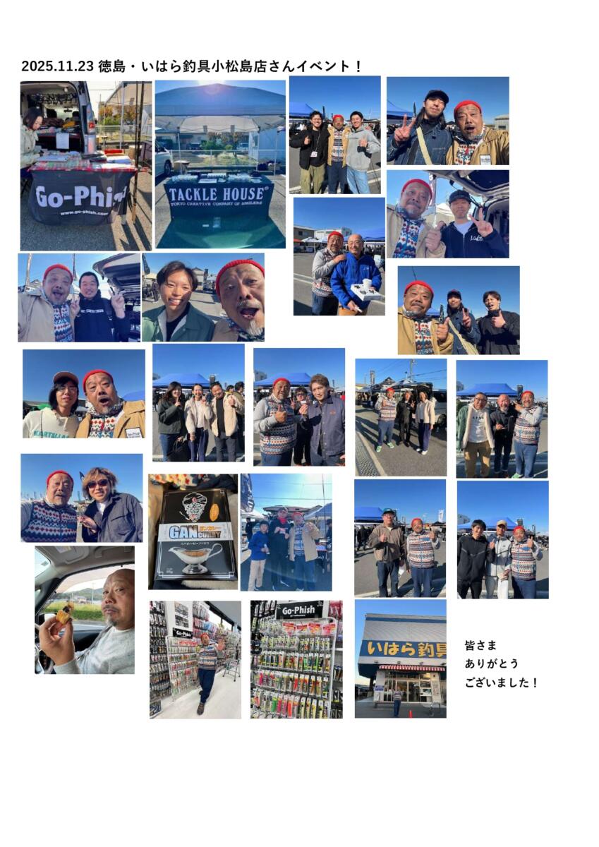 でその徳島。お陰様でここ数年はいはら釣具(本店さん・小松島店さん)でもGo-Phishコーナーも拡充し、また古くは(弓削さんと通った鳴門が懐かしい!(泣))20数年前からここ最近まで知り合った徳島や近県のアングラーさんとの交流もまた増えてGo-Phish好きの皆さんも少しずつでも増えていただけていることに感謝しかありません。今回のイベントでもたくさんの皆さんととても楽しい話が出来たり、オンラインショップをご利用いただいているお客様と直接お会いできたりして感動も!やっぱりいいですね「釣り人の輪」。