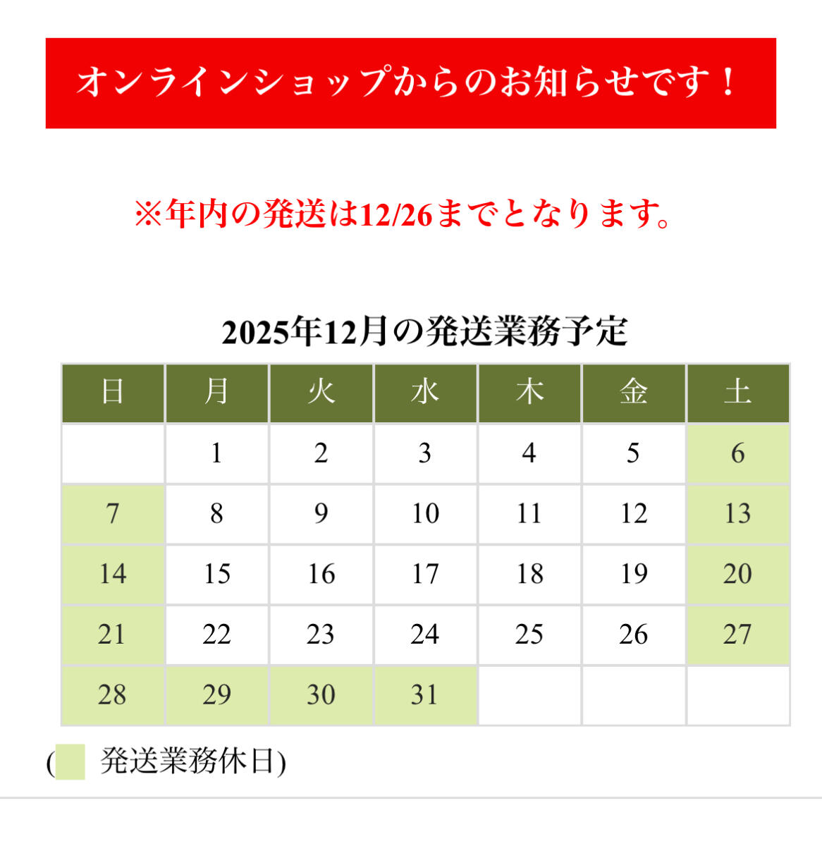 年末の配送業務は12/26までとなります。