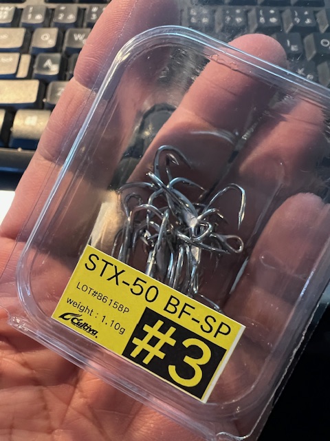 オーナーばりさんからサンプルが届きました!対大型ヒラスズキ用・青物用トリプルフック、STX-50。オーナーばり吉成さんからずーっと話は聞いていまして開発期間も相当だった様ですがいよいよ来春に発売開始とか?
