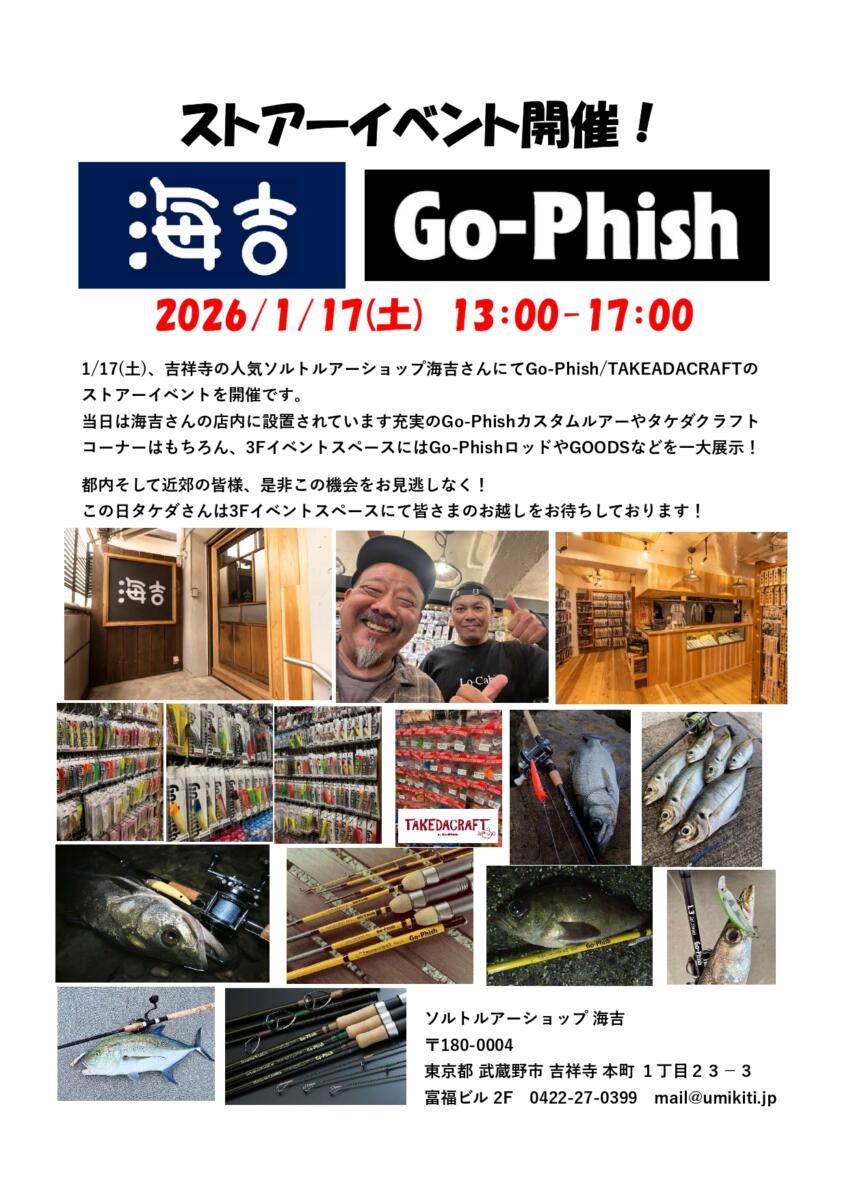時間はどんどん過ぎますね!気づけば来週末!!!!!都内・吉祥寺の海吉さんでのインストアーイベント!1/17(土)13:00-です!都内近郊の皆様もっと近郊の皆さまGo-Phish都内イベントですからどうぞ海吉さんへお越しくださいませ!