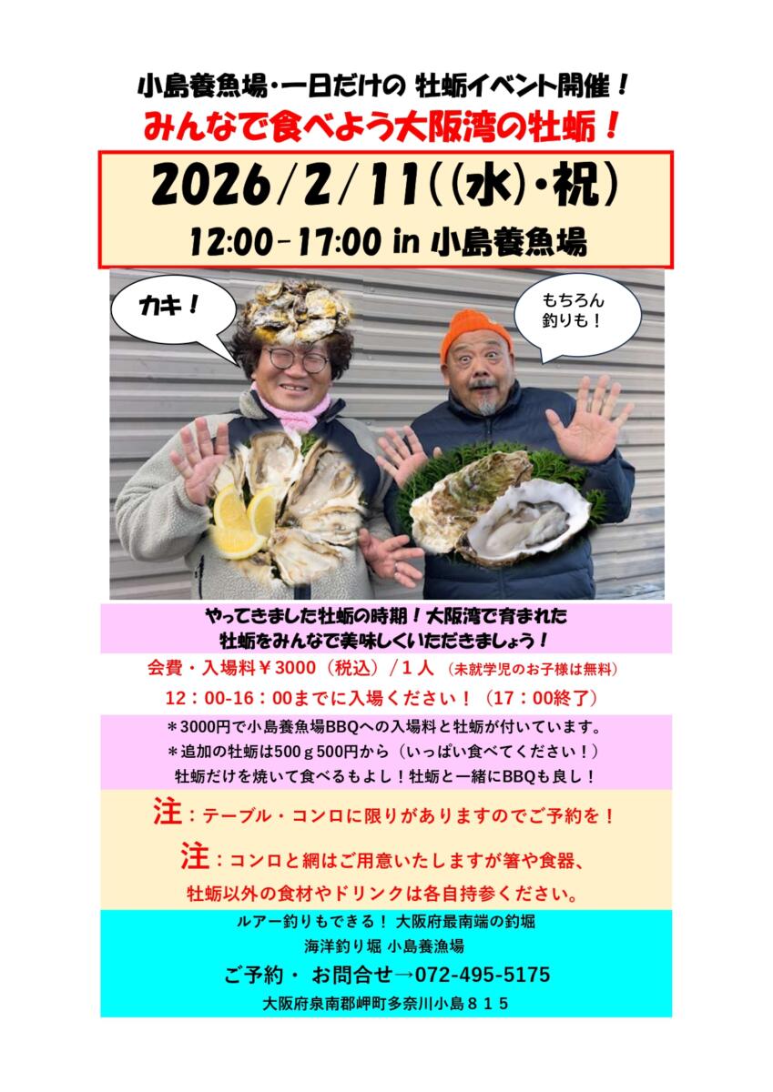 そして2/11(水・祝)は「小島養魚場で旬の大阪湾牡蛎を食べよう!」っというイベント決定です!美味しいに決まってます(笑)席数やコンロの数がございますのでご参加希望の皆様はGo-Phishまたは小島養魚場、中島さんまでご予約を!