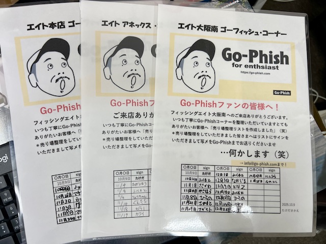 エイト本店・萩原店長さんのアイデアでスタートした「Go-Phish売り場整理企画」。本店さん、アネックスさん、大阪南さんと皆さまありがとうございました。売り場整理をしていただいた皆さんとのやりとりもとても楽しく嬉しい企画でした!またこんな楽しそうな企画があれば是非と思います!イチバンエイトグループ様、いつもありがとうございます。