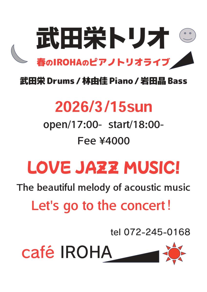 そしてタケダさんのさらに超観て欲しいライブが3/15(日)大阪 堺のcafeIROHAさんにて!!!!!終始ピアノトリオのたっぷりライブ。皆様どうぞお誘いあわせの上IROHAさんへ電話でご予約をお願いいたします!!