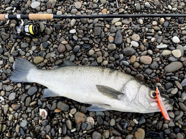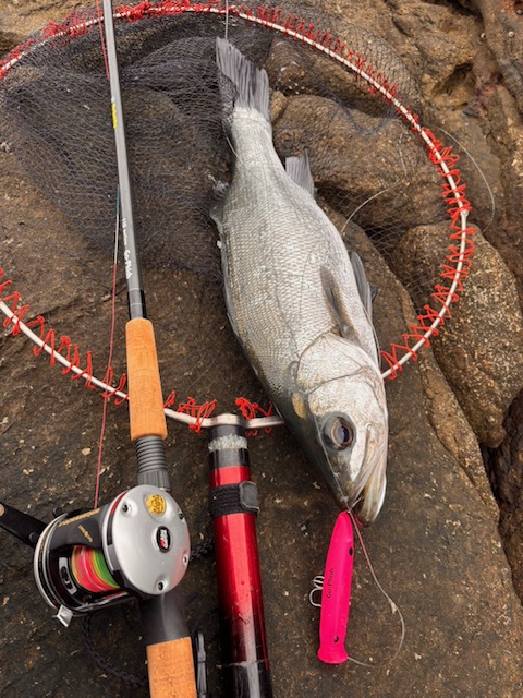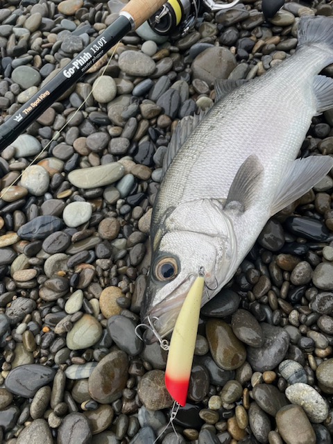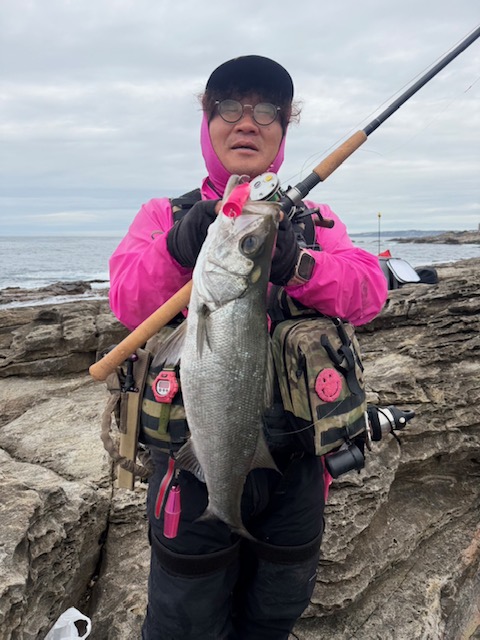 ヒラスズキデイ!…Yくんはmaster plugger13.0TにTKLM120GP&24G(イケてますヴィンテージノンアイRH)で3連発!そして起き磯に上がった中島くん、Go-Phish11B&ABUそして100-Pで!(これまたマットピンクがイケてます!)…おめでとうございます!やったね!…真のヒラスズキ釣り!…Go-Phishスタイルであります!