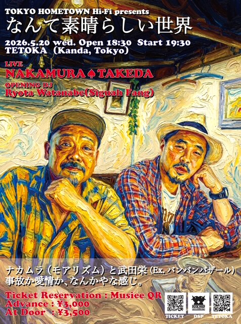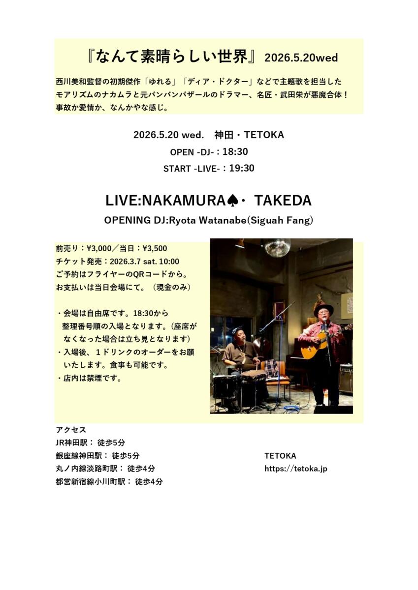 いつぶりでしょうか東京?2026.5.20wed 都内神田のTETOKAさんにてタケダさん演奏です。友人の凄腕音楽関係者KAWAHARAくんの企画で実現しました(ありがとう!)。モアリズムナカムラ♠とのデュオ。素晴らしい歌とギター、そして名匠?タケダさんのドラム。都内そして関東近郊の皆様5/20はどうぞお集まりくださいませ!…よろしくお願いいたします。