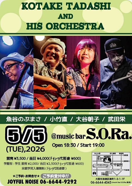5/5(火) 大阪市中央区 連休さなかのミナミ、なんばSORa。素晴らしいサウンドでお届けします!