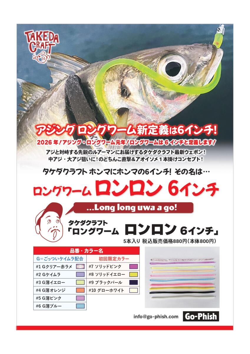 2026年ビッグニュースのひとつはこのロンロン発売!!…これでしょもう!(笑)ワームだろうがプラグだろうがジグだろうが、見せかけだけの新製品なんて何の意味も無い。スタイル、メソッド、新発見、体感、衝撃!…。このロンロンで新たなアジングを皆さん!どうぞお楽しみにもうしばしお待ちください!!