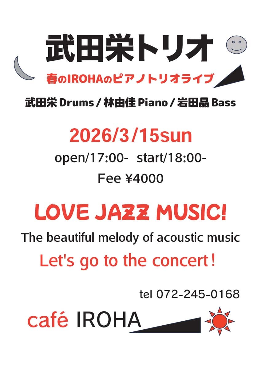 イベント&ライブ情報 【日時】2026年2月7日 【場所】堺 こふん前cafe IROHA 【日時】2026年2月11日 【場所】小島養魚場 http://kojima-fm.jp/ 【日時】2026年2月28日 【場所】HOBO’S BAR 【日時】2026年3月8日 【場所】愛知県一宮市のプロショップCALYPSO 【日時】2026年3月15日 【場所】堺 こふん前cafe IROHA 【日時】2026年4月17日・18日 【場所】長崎県平戸市 LUCKY DINER